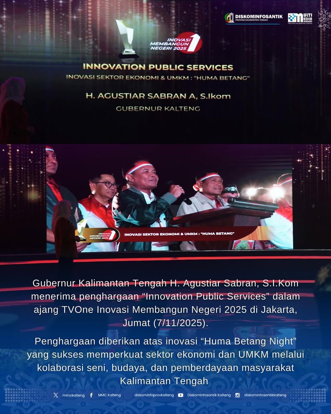 Penghargaan ini diberikan atas inovasi “Huma Betang Night”, program yang sukses memperkuat sektor ekonomi dan UMKM melalui kolaborasi seni, budaya, dan pemberdayaan masyarakat.