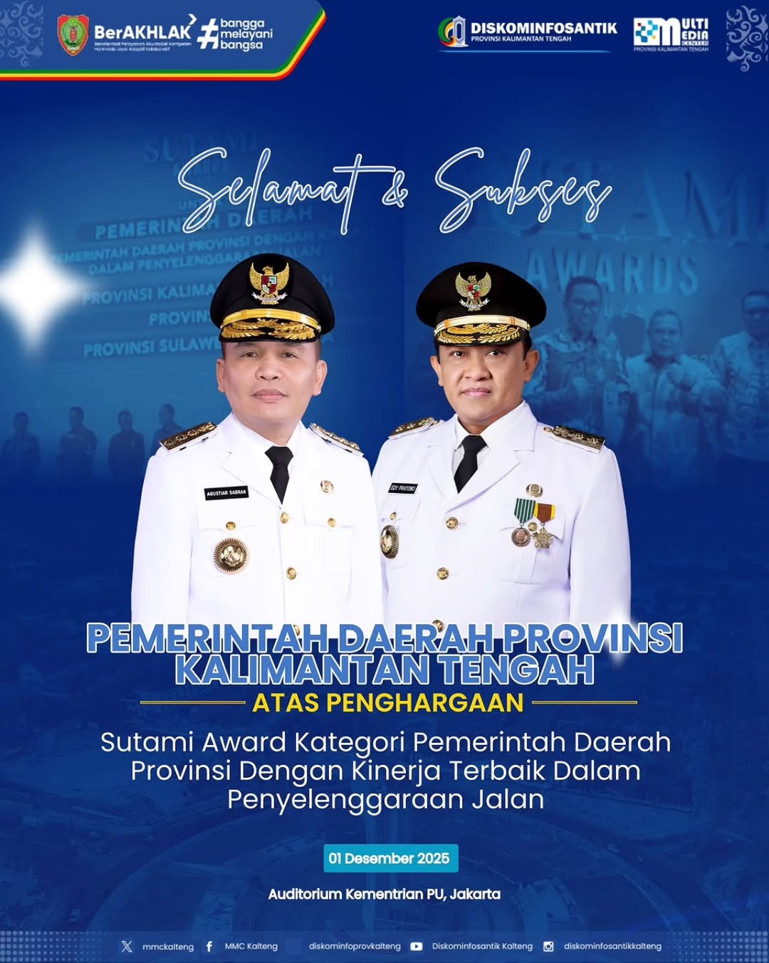 Selamat dan sukses Pemerintah Provinsi Kalimantan Tengah atas raihan Sutami Award 2025 sebagai Pemerintah Daerah Provinsi dengan Kinerja Terbaik dalam Penyelenggaraan Jalan.