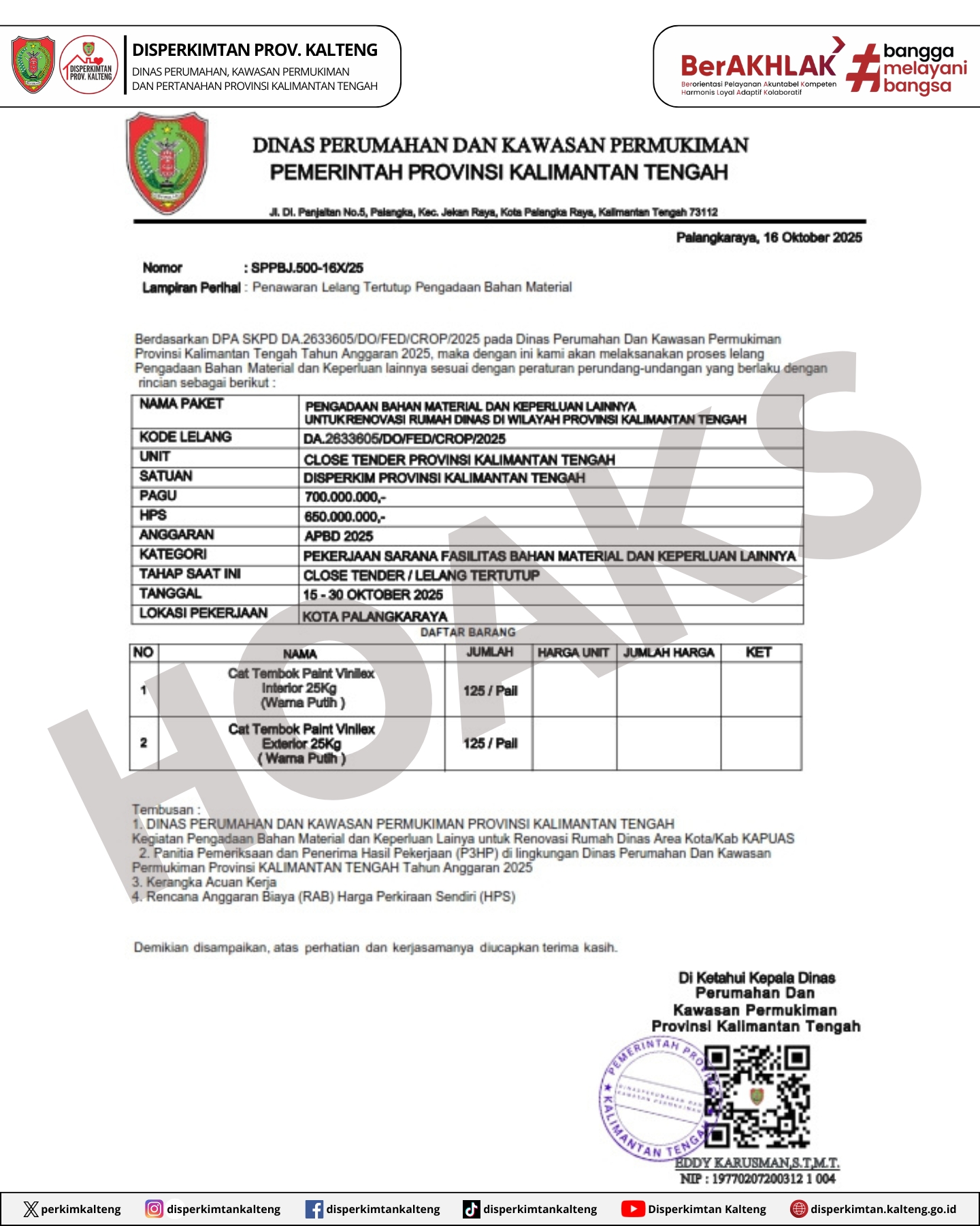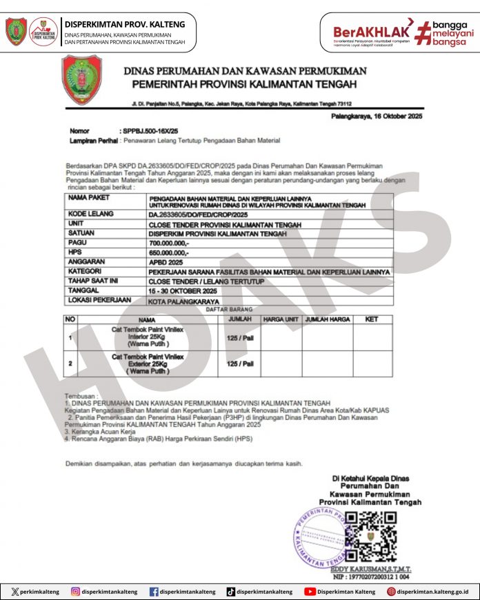 Belakangan ini beredar surat yang mengatasnamakan Dinas Perumahan, Kawasan Permukiman dan Pertanahan (Dinas Perkimtan) Provinsi Kalimantan Tengah terkait pengadaan bahan material dan kebutuhan lainnya untuk renovasi rumah dinas di wilayah Provinsi Kalimantan Tengah.