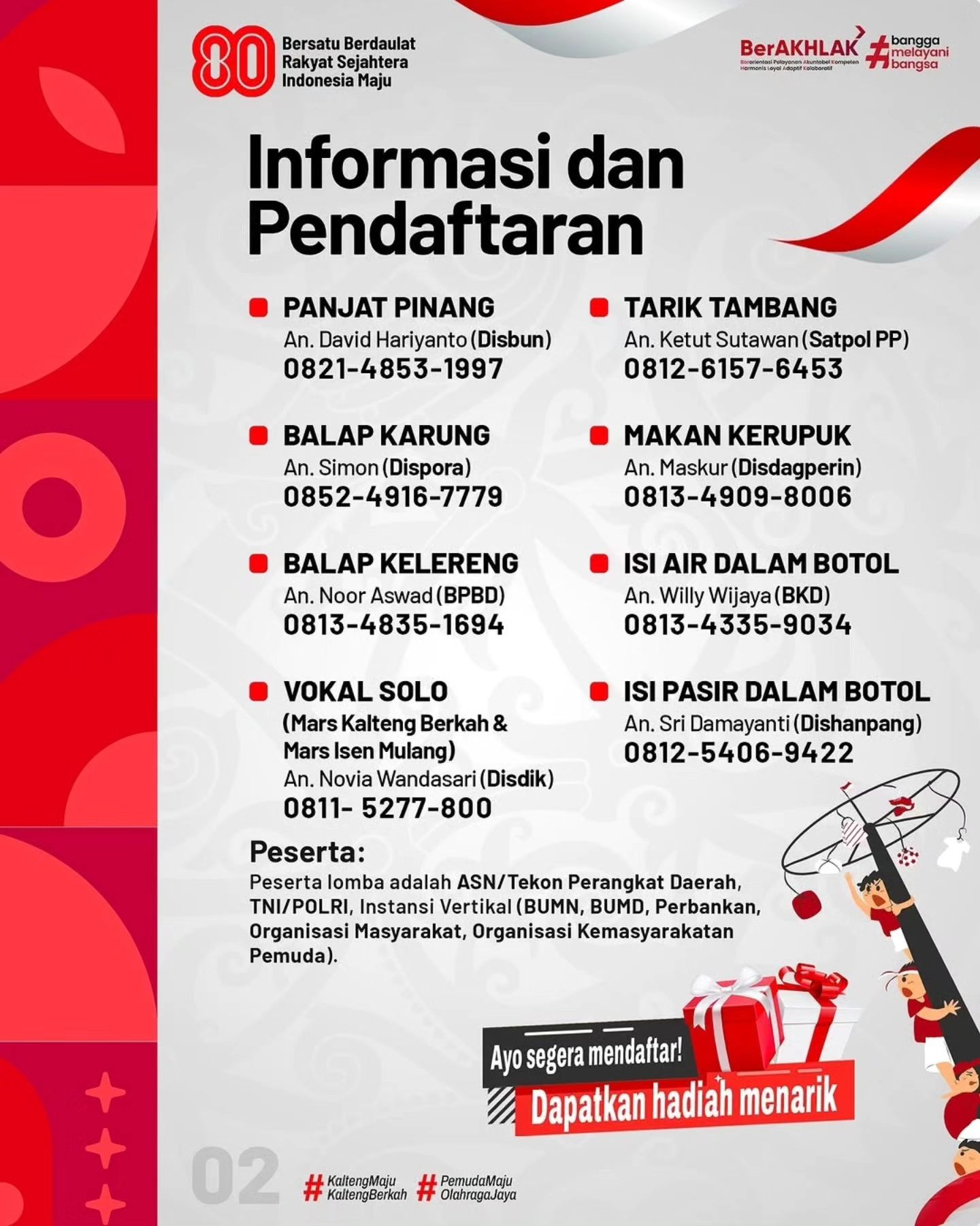 Silakan hubungi kontak panitia sesuai jenis lomba yang tercantum pada poster.