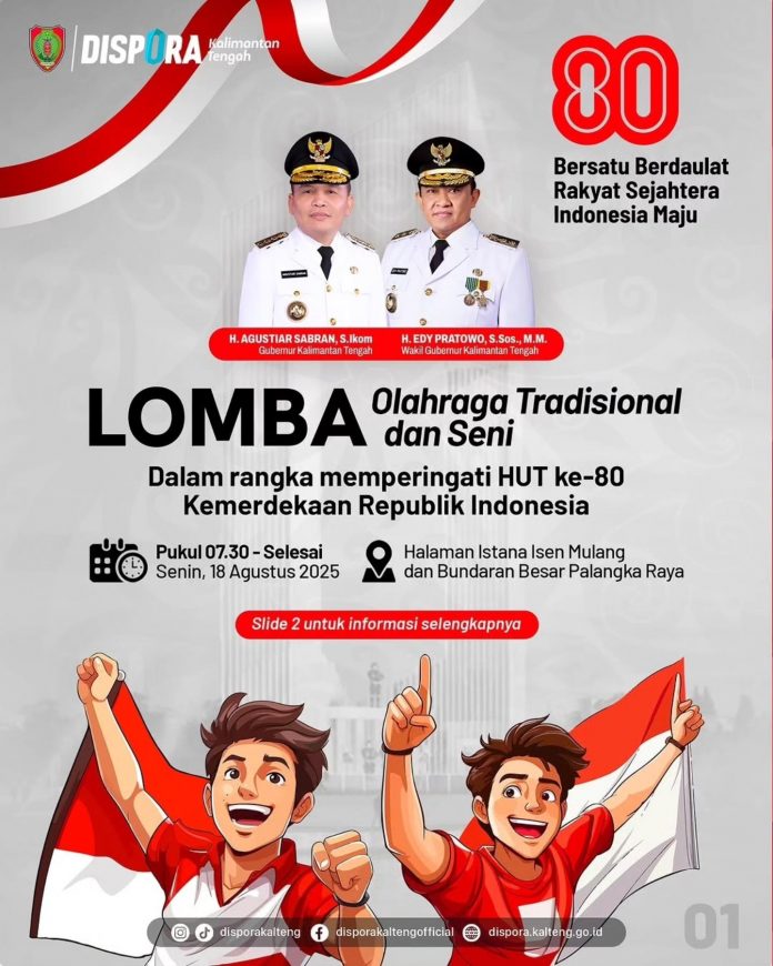 Mari rayakan momen bersejarah ini dengan penuh semangat melalui lomba olahraga tradisional dan seni yang diselenggarakan oleh Pemerintah Provinsi Kalimantan Tengah.