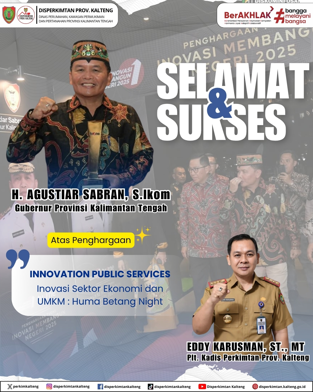 Berhasil meraih Penghargaan “Innovation Public Services” melalui program inovatif “Huma Betang” di sektor ekonomi & UMKM.